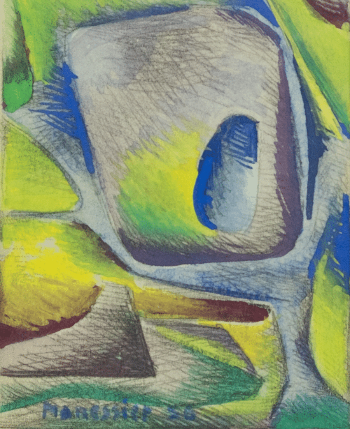 Aquarel met potlood op papier. 1956, gesigneerd l.o. Afmetingen afbeelding ca 6,5*9,5 cm, lijst ca 24*30 cm.