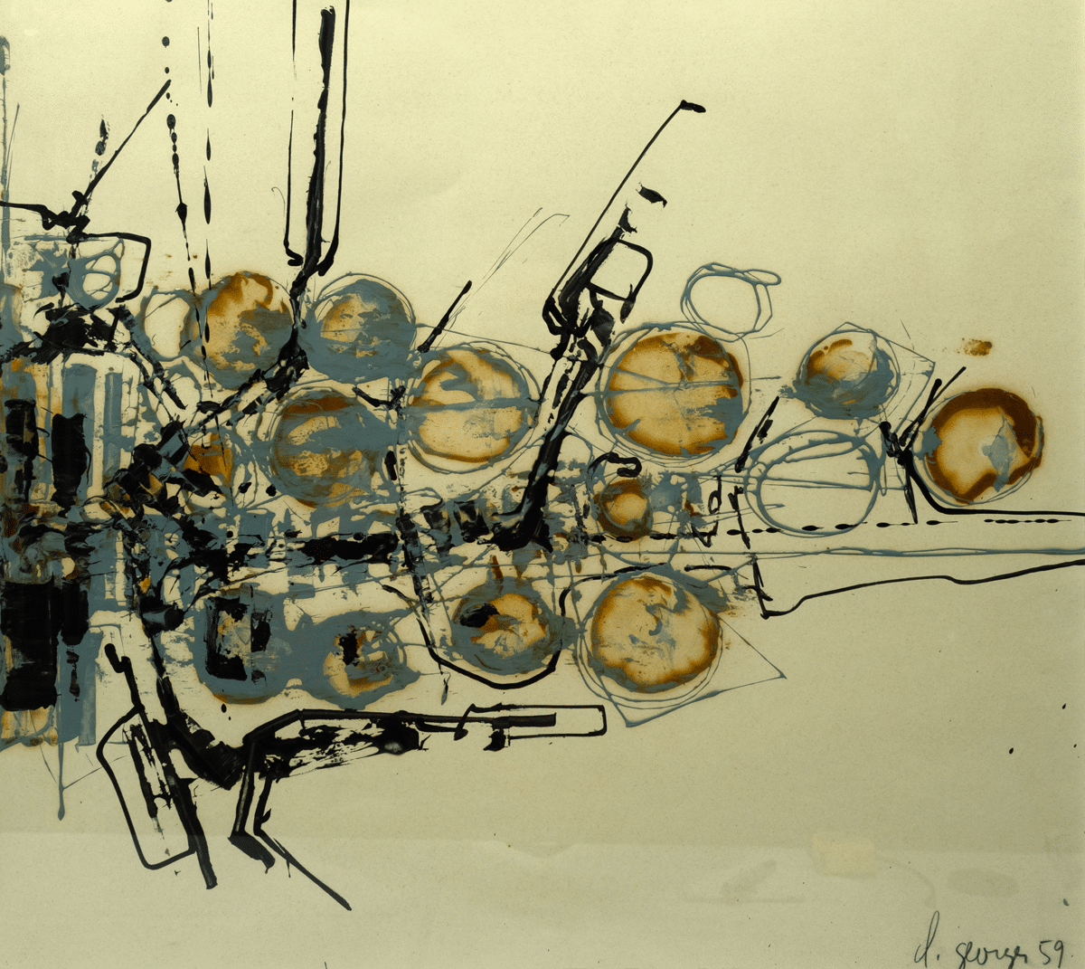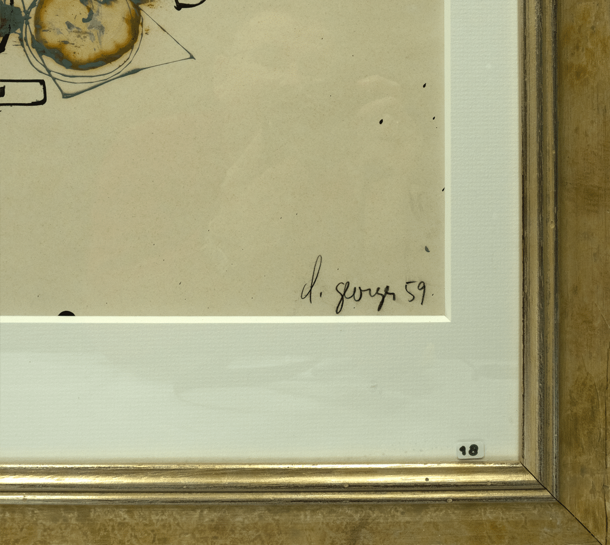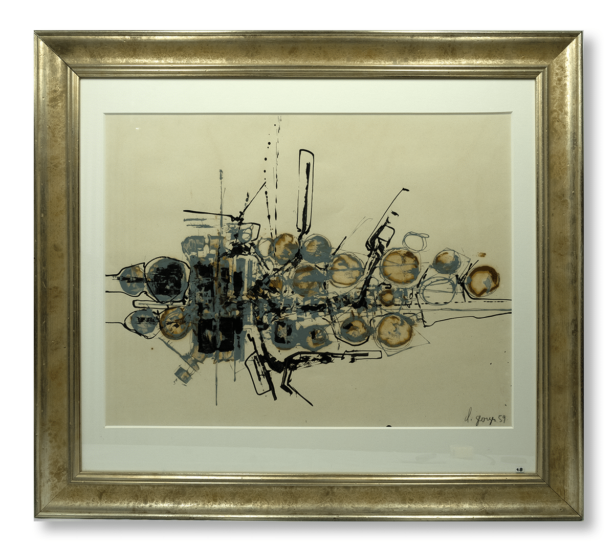 Olieverf op papier. 1959. Afmetingen afbeelding ca 64*49 cm, lijst ca 83*68 cm. Gesign. r.o. 1959.