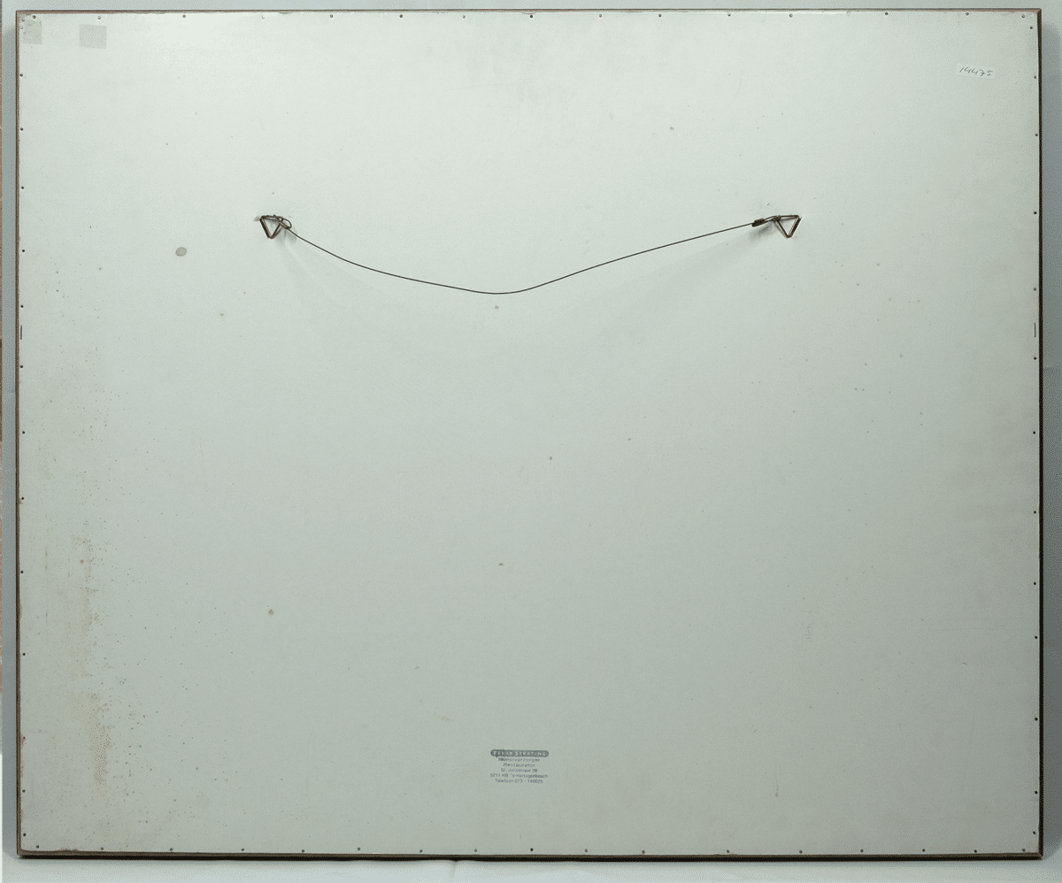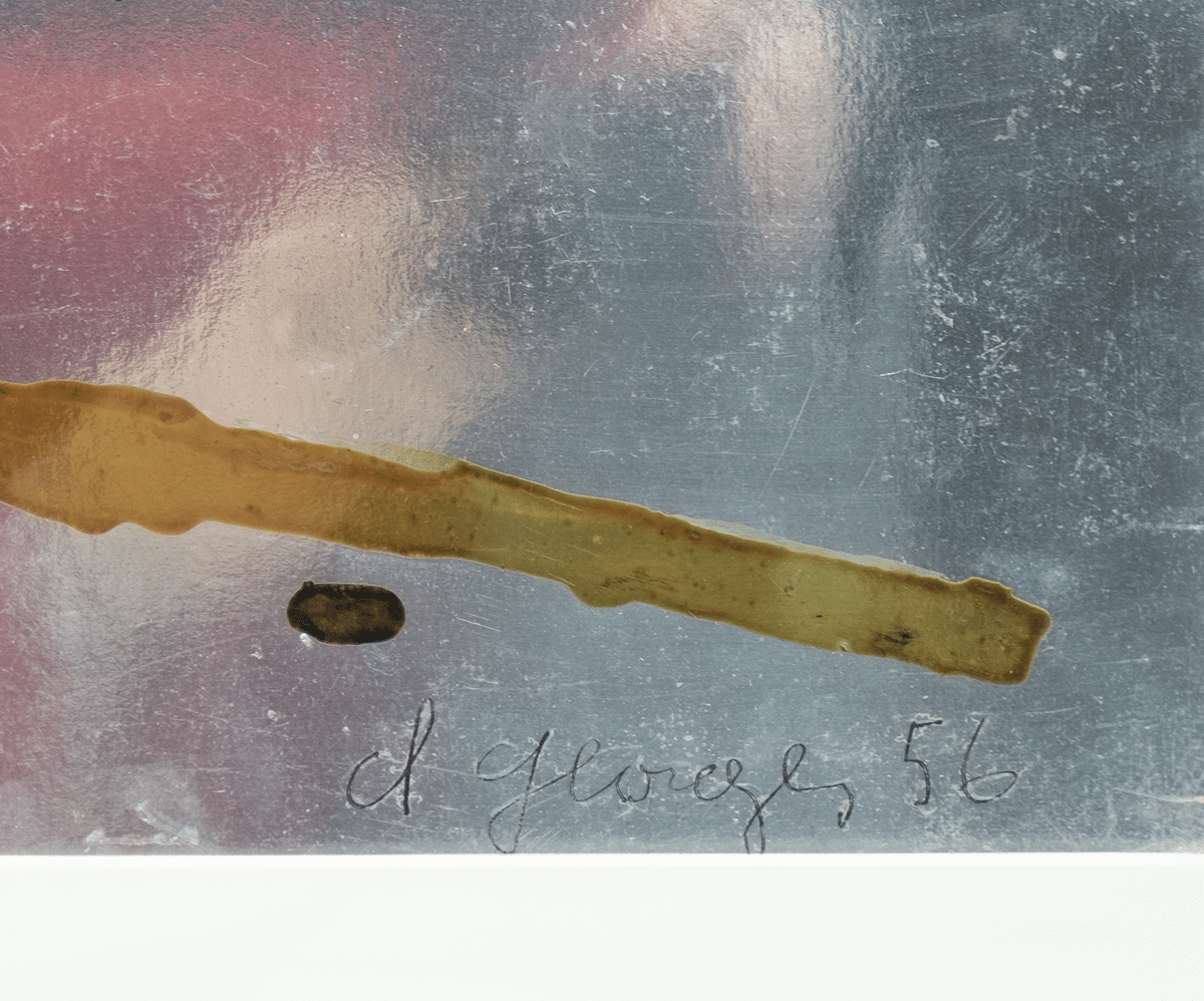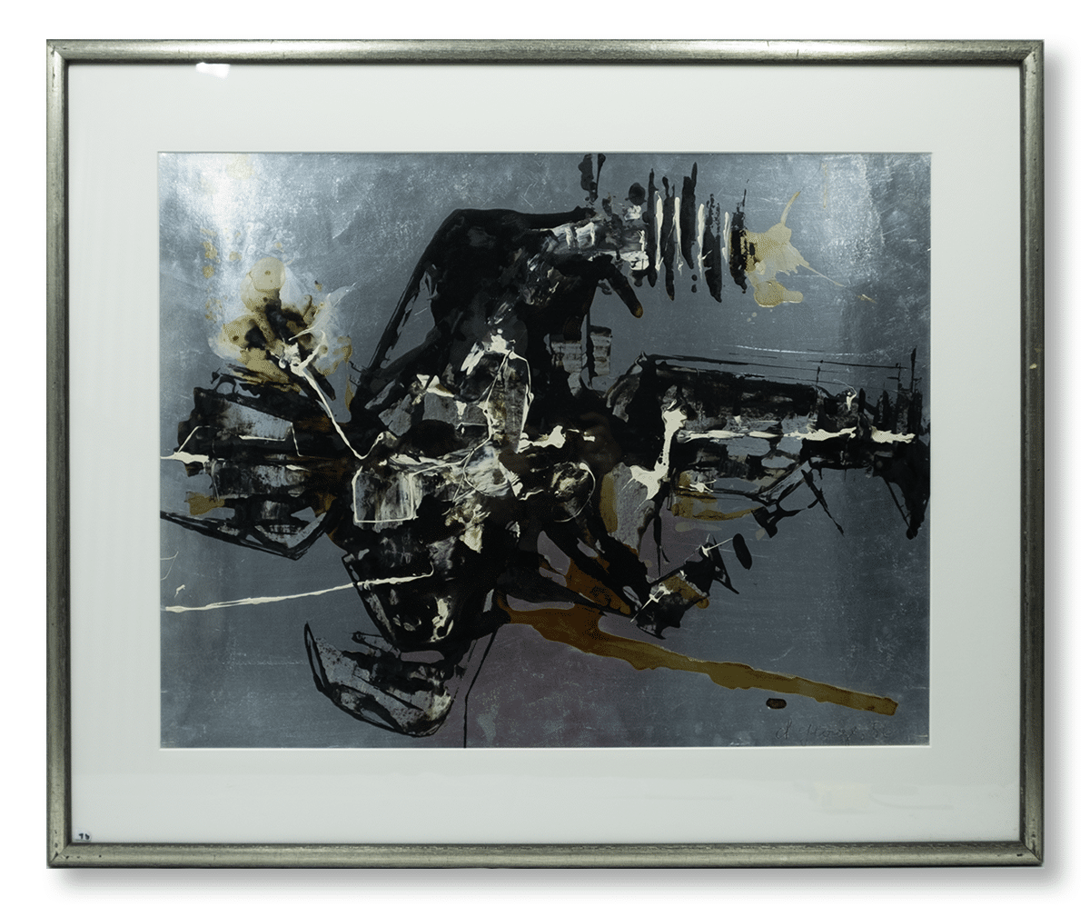 Olieverf op zilverkleurig papier. 1956. Afmetingen ca 64*49 cm (afbeelding, reflecties bij fotograferen), lijst ca 85,5*76 cm. Gesign. r.o. 1956.