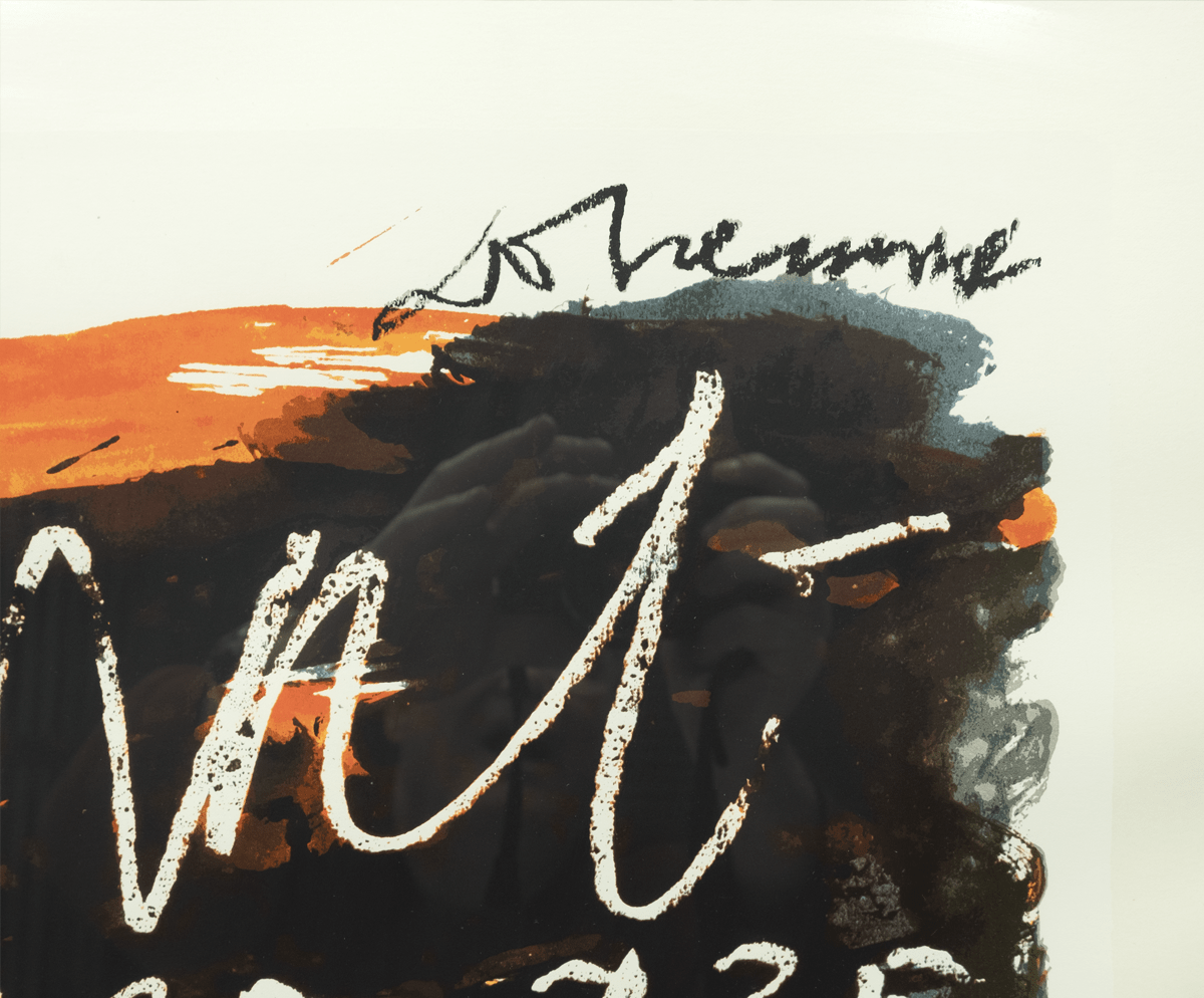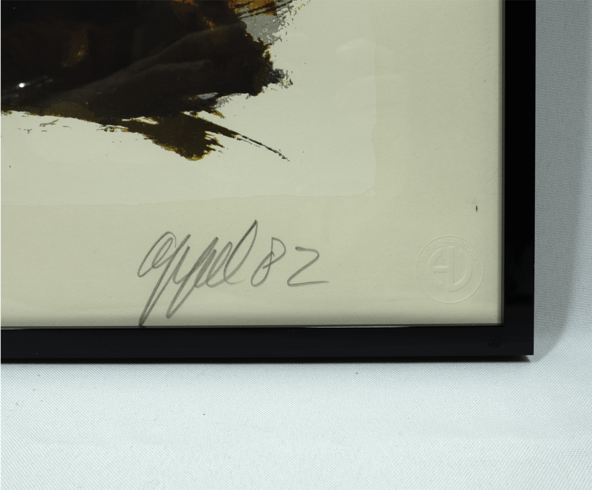 Zeefdruk. 1982. Afmetingen afbeelding ca 63*52 cm, lijst ca 78*67 cm. Gesign. r.o. in potlood (Appel) en in druk (Dotremont). De aangeboden zeefdruk maakt onderdeel uit van “Duo pour Pinceau et Crayon”, zes zeefdrukken waarbij de zwarte lijnen door Christian Dotremont en de kleuren van door Karel Appel gemaakt zijn.