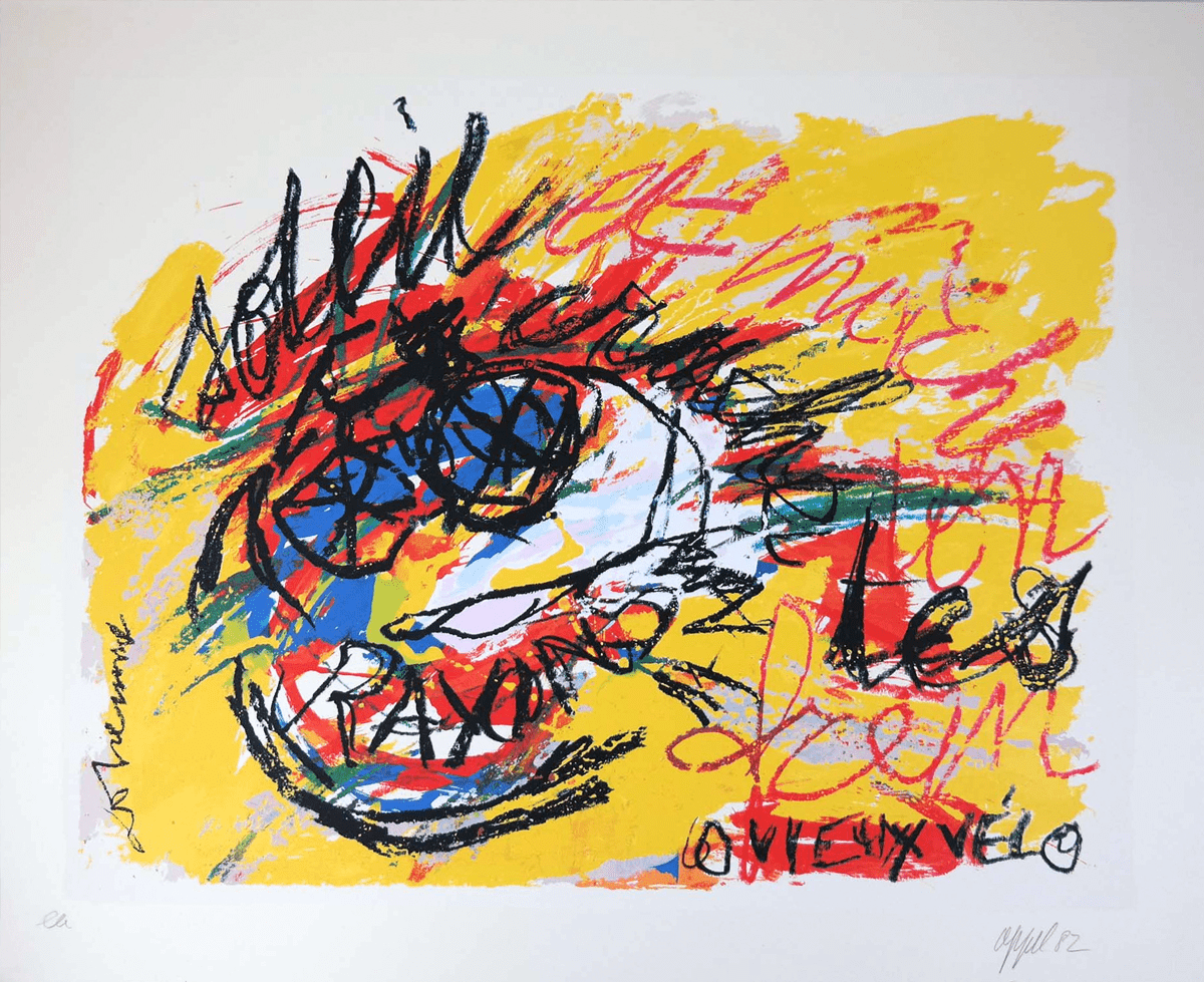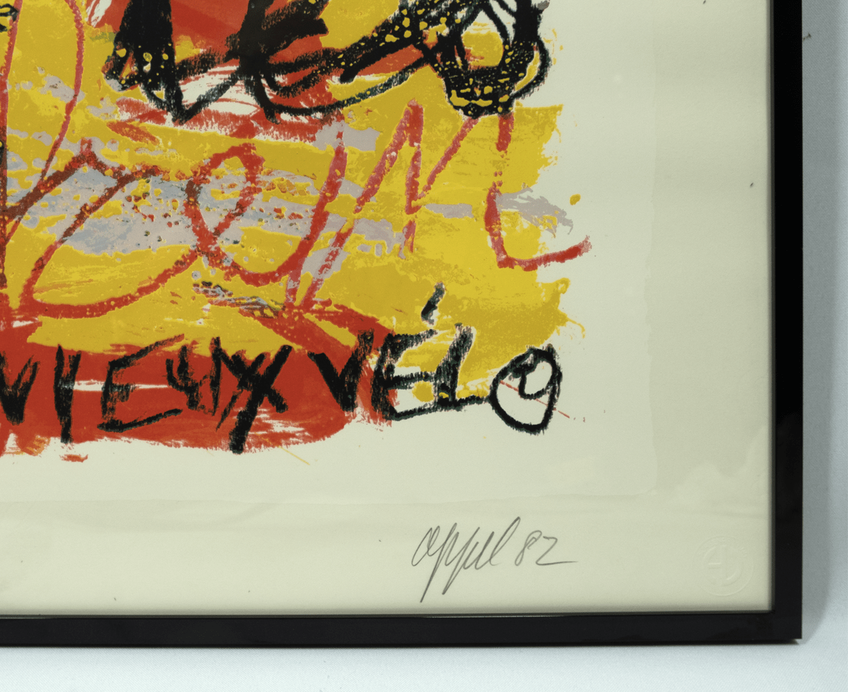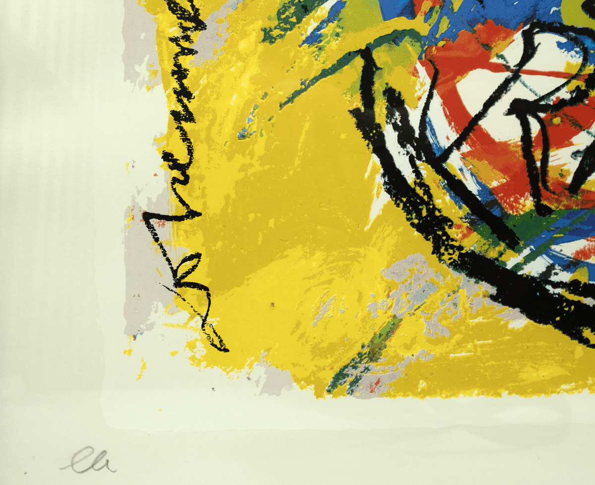 Zeefdruk. 1982. Afmetingen afbeelding ca 63*52 cm, lijst ca 78*67 cm. Gesign. r.o. in potlood (Appel) en in druk (Dotremont).De aangeboden zeefdruk maakt onderdeel uit van “Duo pour Pinceau et Crayon”, zes zeefdrukken die in 1977 gemaakt zijn en waarbij de zwarte lijnen door Christian Dotremont en de kleuren van door Karel Appel gemaakt zijn. De zeefdrukken zijn in een oplage van 90 stuks en enkele E.A.’s gemaakt. Dit exemplaar komt uit de collectie van de drukker Henk van der Vet.