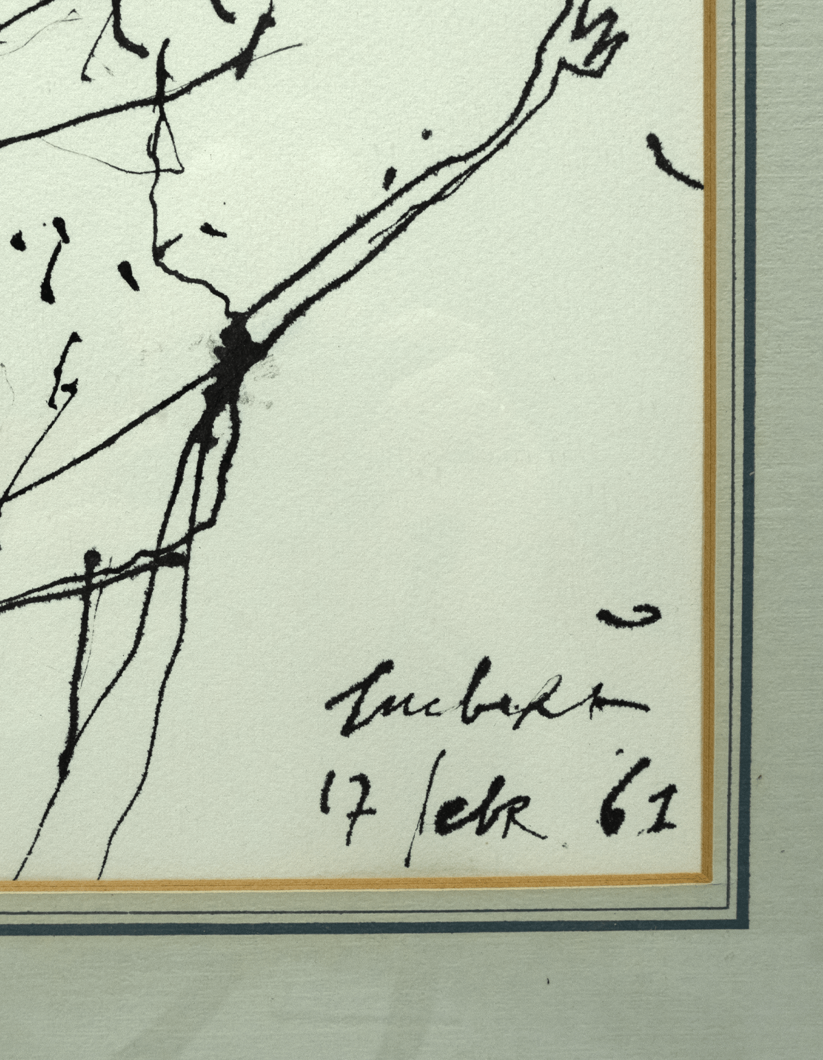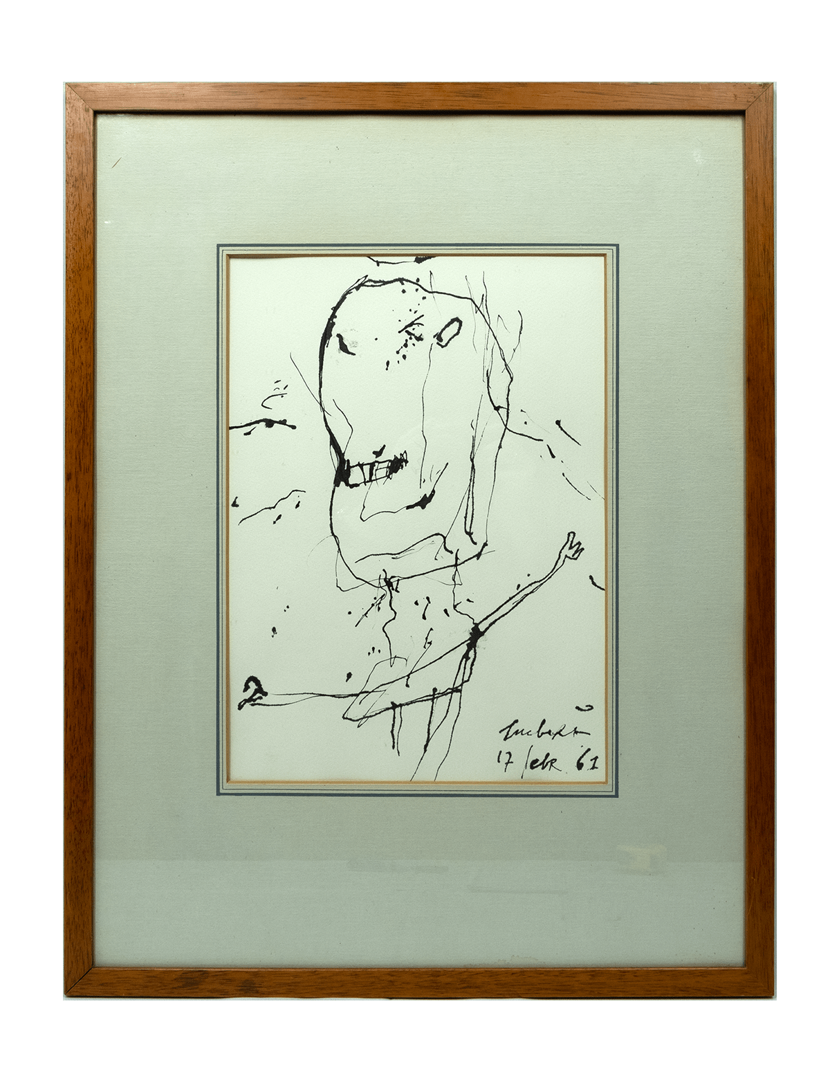 Pentekening. 1961. Afmetingen afbeelding ca 26*49 cm, lijst ca 36*63 cm. Gesign. r.o. 17 febr. 1961. Vochtplek onderaan op het passepartout.