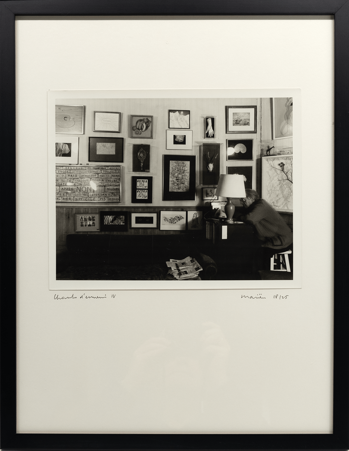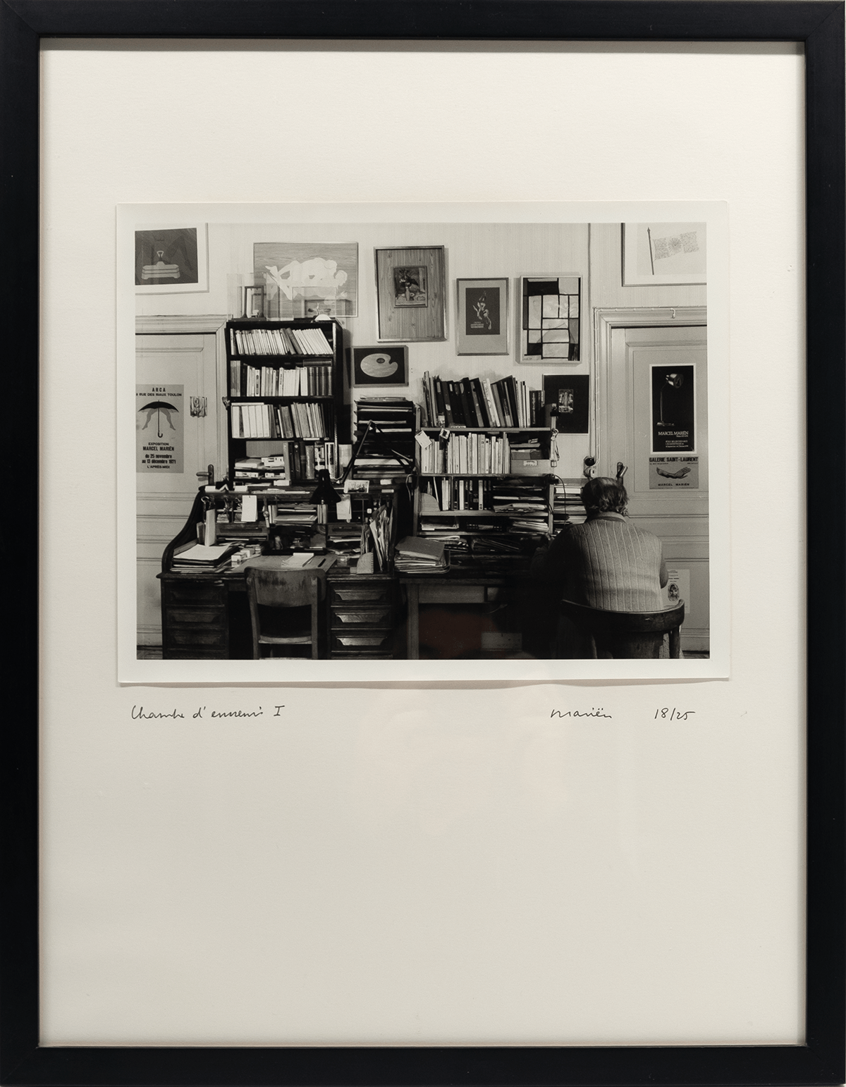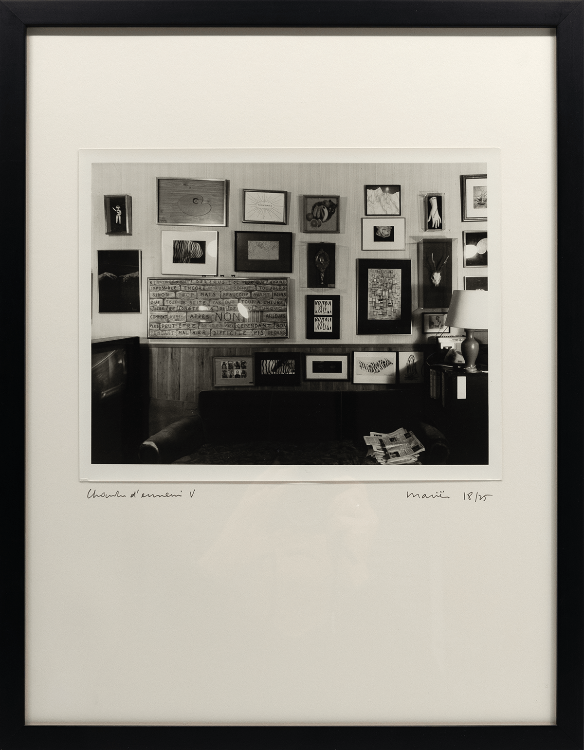 Vijf foto’s, gesigneerd, genummerd en getiteld door Mariën en een tekst (gedateerd 19.2.1991) van Mariën. 18/25 (plus 11 hc exemplaren). De foto’s zijn gedrukt door Carine Demeter, Antwerpen. Uitgegeven door Max Pisti, Antwerpen, 1991. Afmetingen foto’s ca 28,5*21,5 cm, geplakt op Steinbach papier 39*51 cm. Lijsten 42*54 cm.