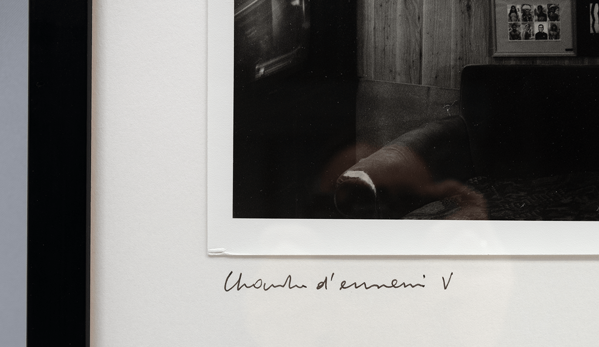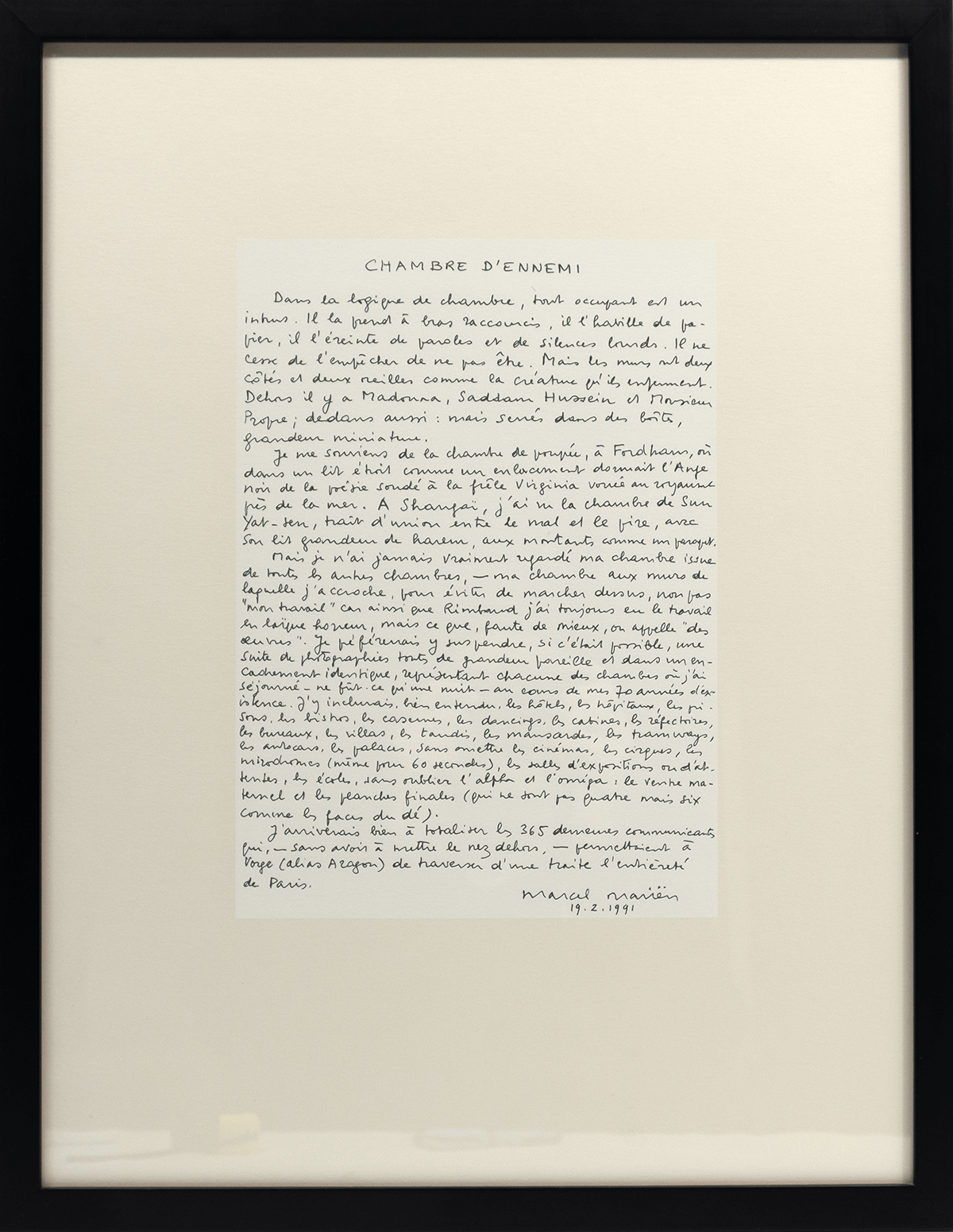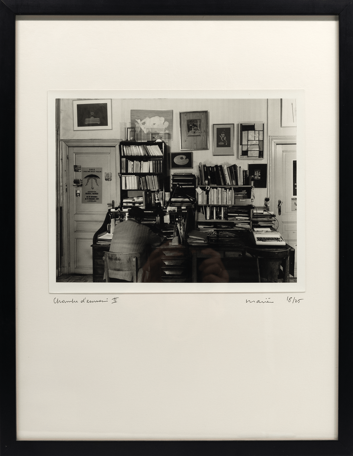 Vijf foto’s, gesigneerd, genummerd en getiteld door Mariën en een tekst (gedateerd 19.2.1991) van Mariën. 18/25 (plus 11 hc exemplaren). De foto’s zijn gedrukt door Carine Demeter, Antwerpen. Uitgegeven door Max Pisti, Antwerpen, 1991. Afmetingen foto’s ca 28,5*21,5 cm, geplakt op Steinbach papier 39*51 cm. Lijsten 42*54 cm.