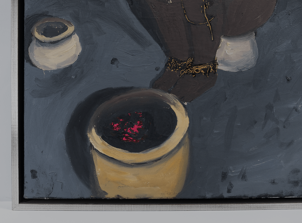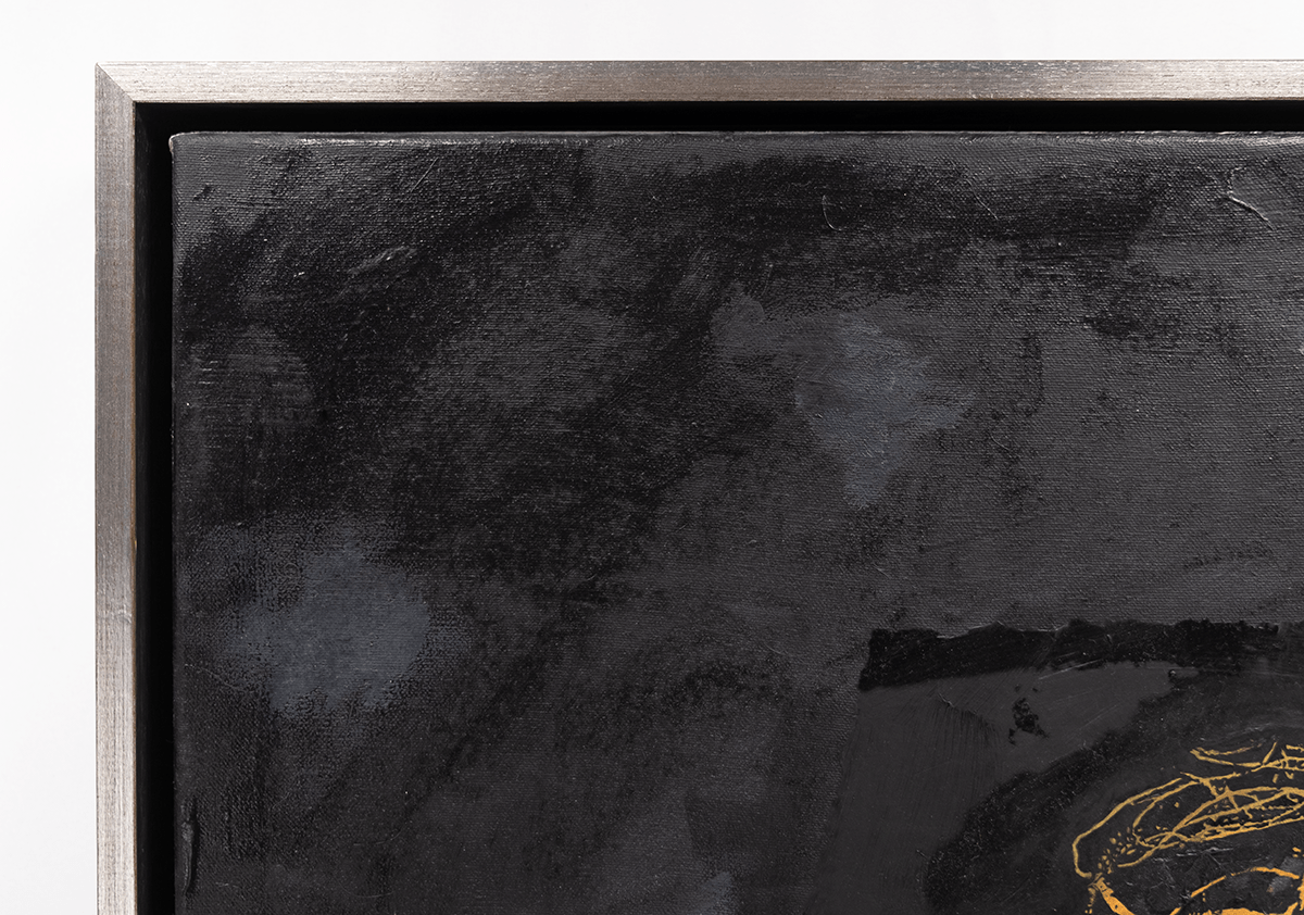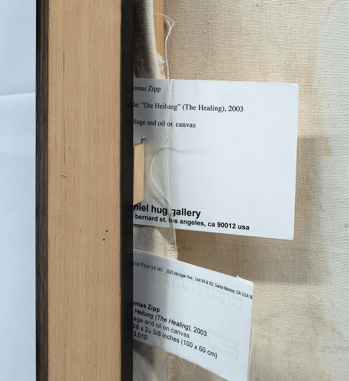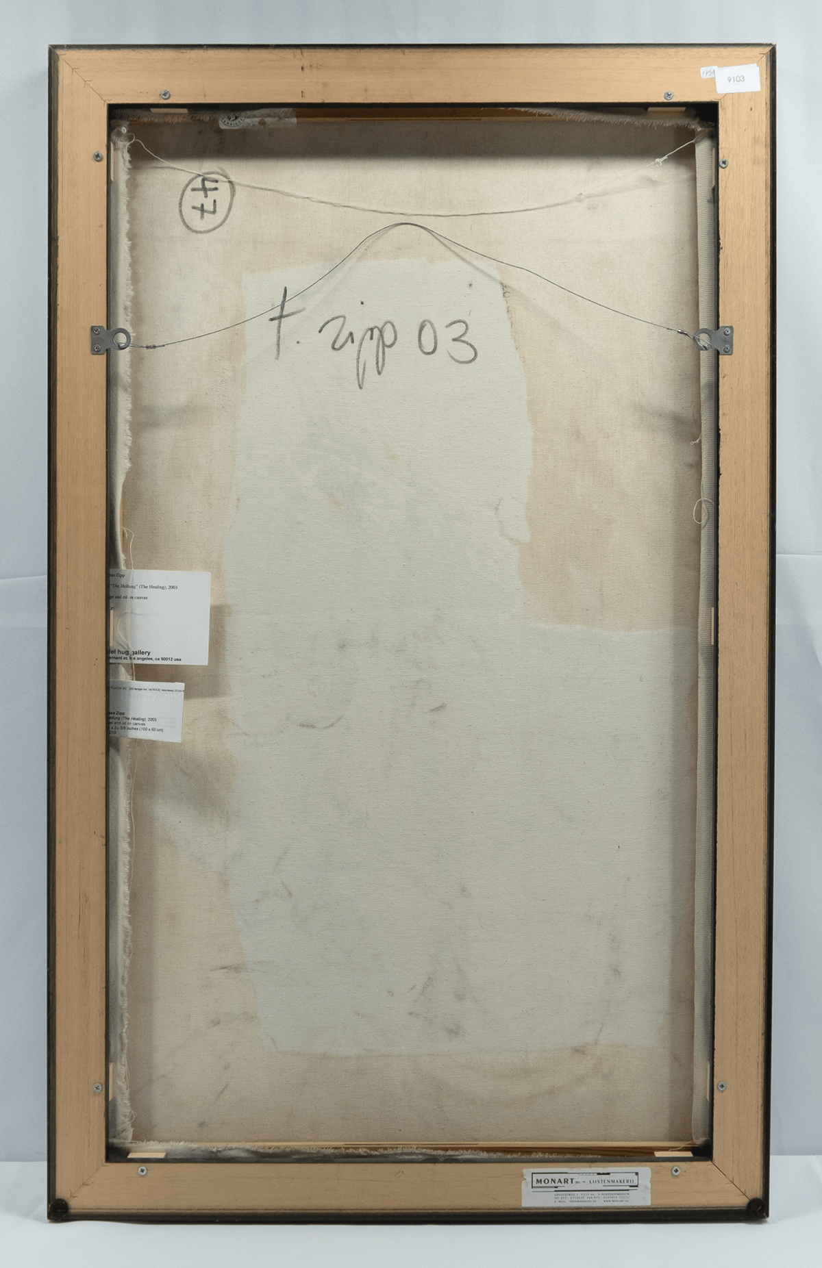 Collage en olieverf op doek, 2003 Gesigneerd en gedateerd op de achterkant: 03 en genummerd 47. Afmetingen afbeelding ca 60*100 cm, lijst ca 64,5*100,5 cm.