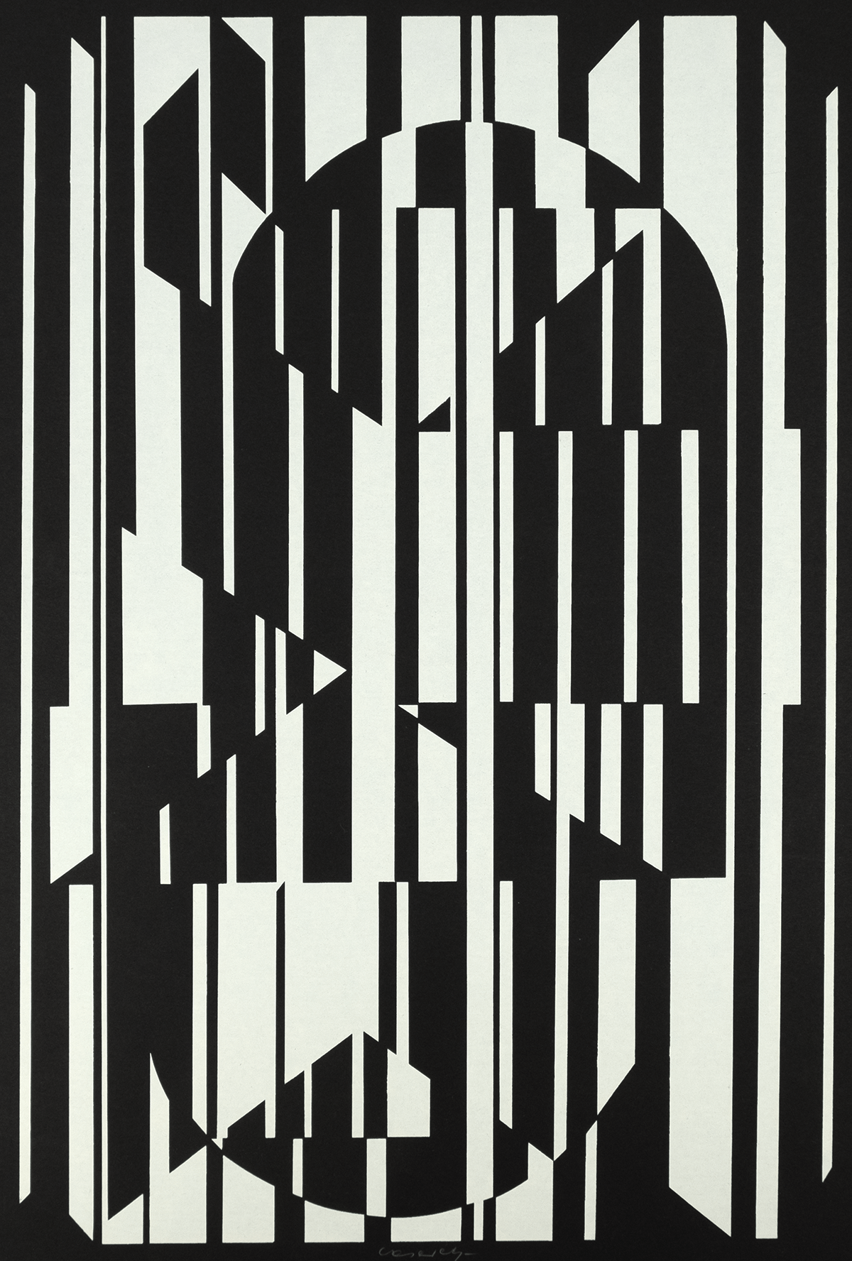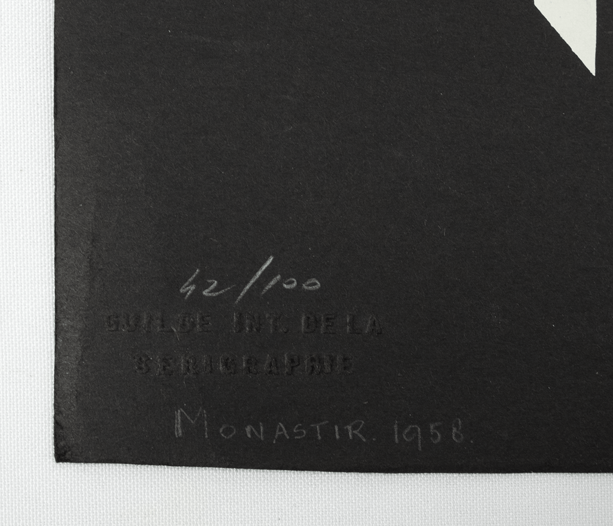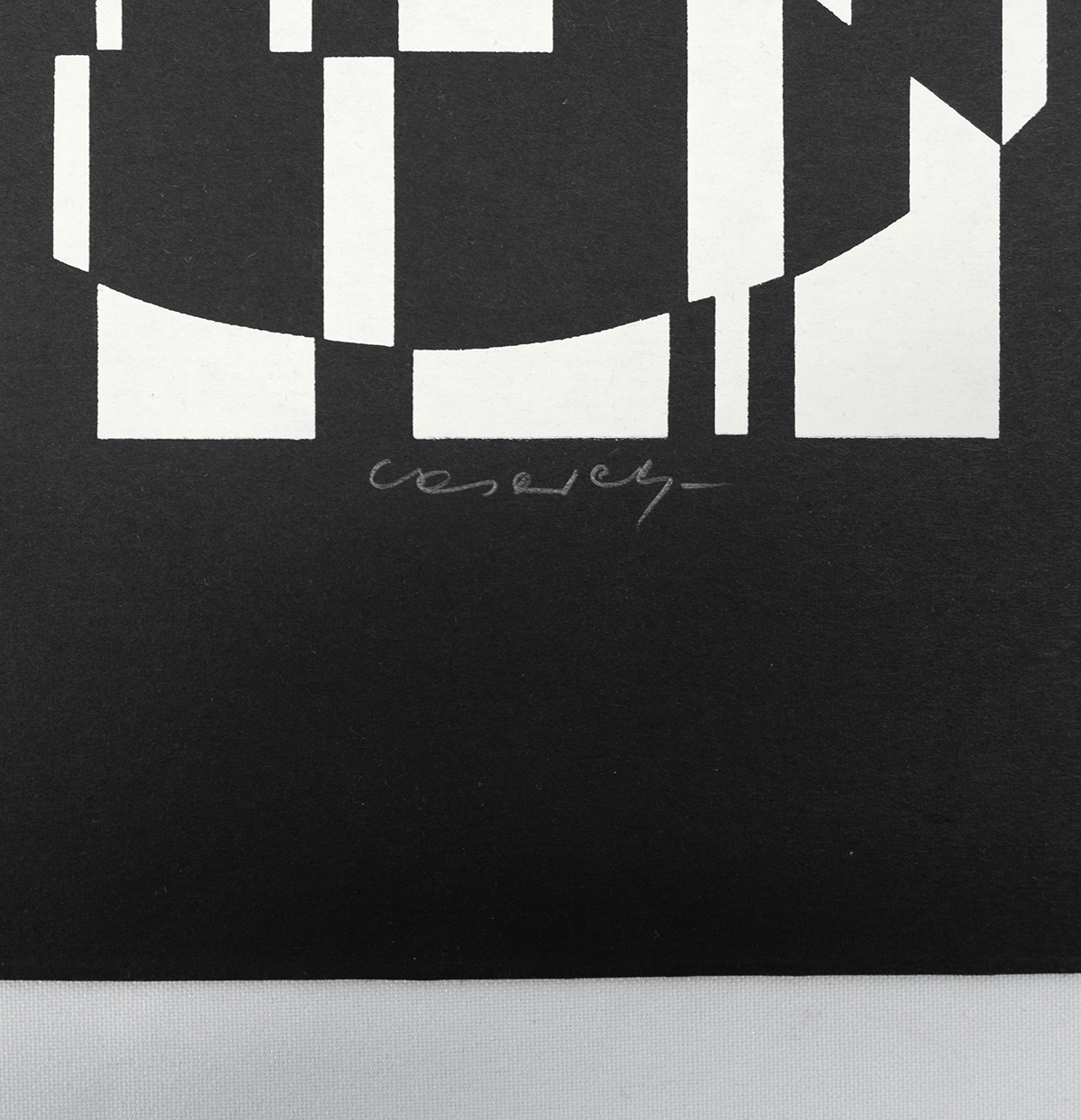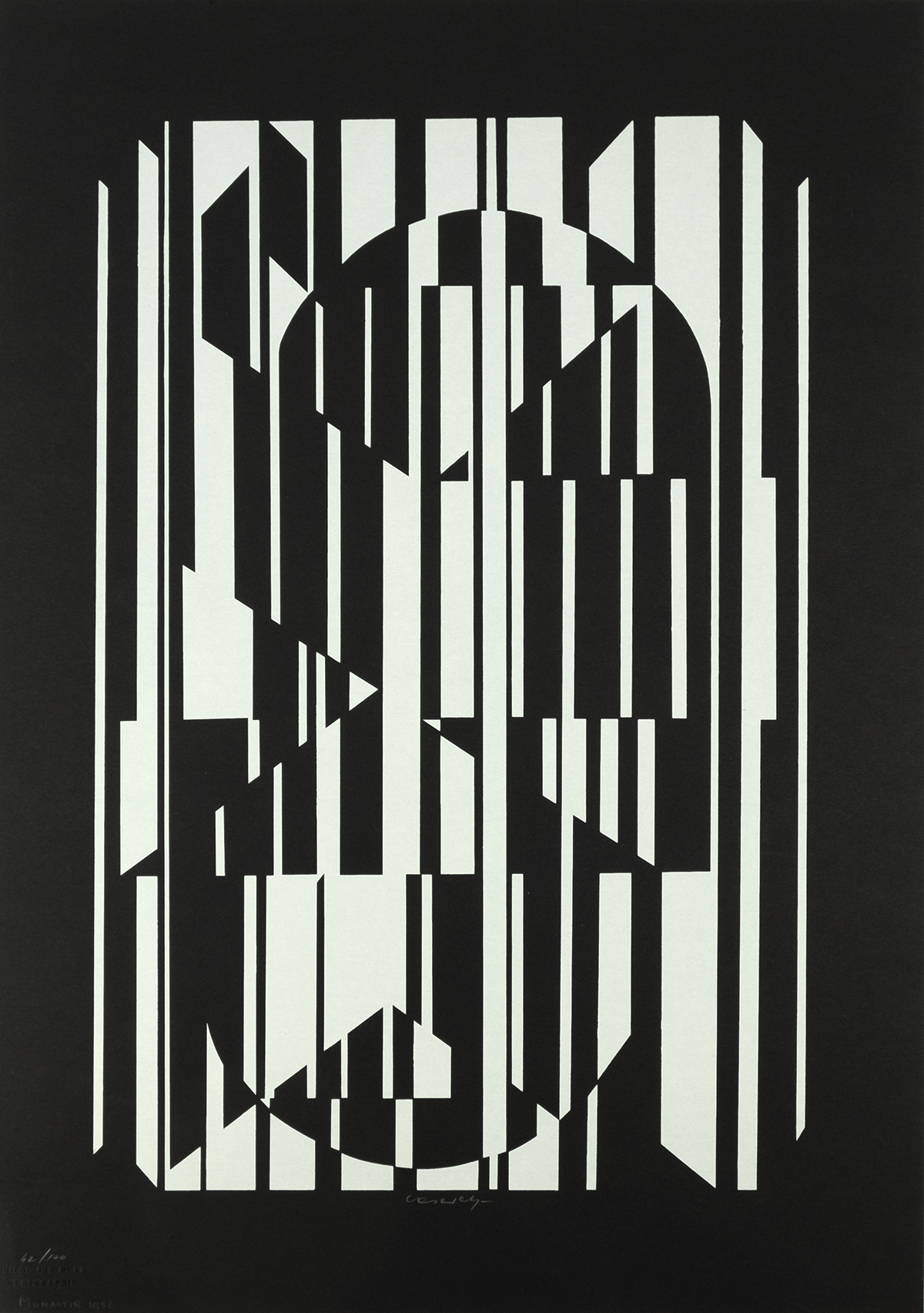 Zeefdruk op papier, gesigneerd midden onder Vasarely en genummerd linksonder 42/100. 1958. Uitgegeven door Guilde Internationale de la Serigraphie, Basel (blindstempel). Kleine gebruikssporen aan de randen op sommige plaatsen, zeer vage vouw in de linker benedenhoek, in zeer goede staat. Afmetingen ca 50*70 cm.