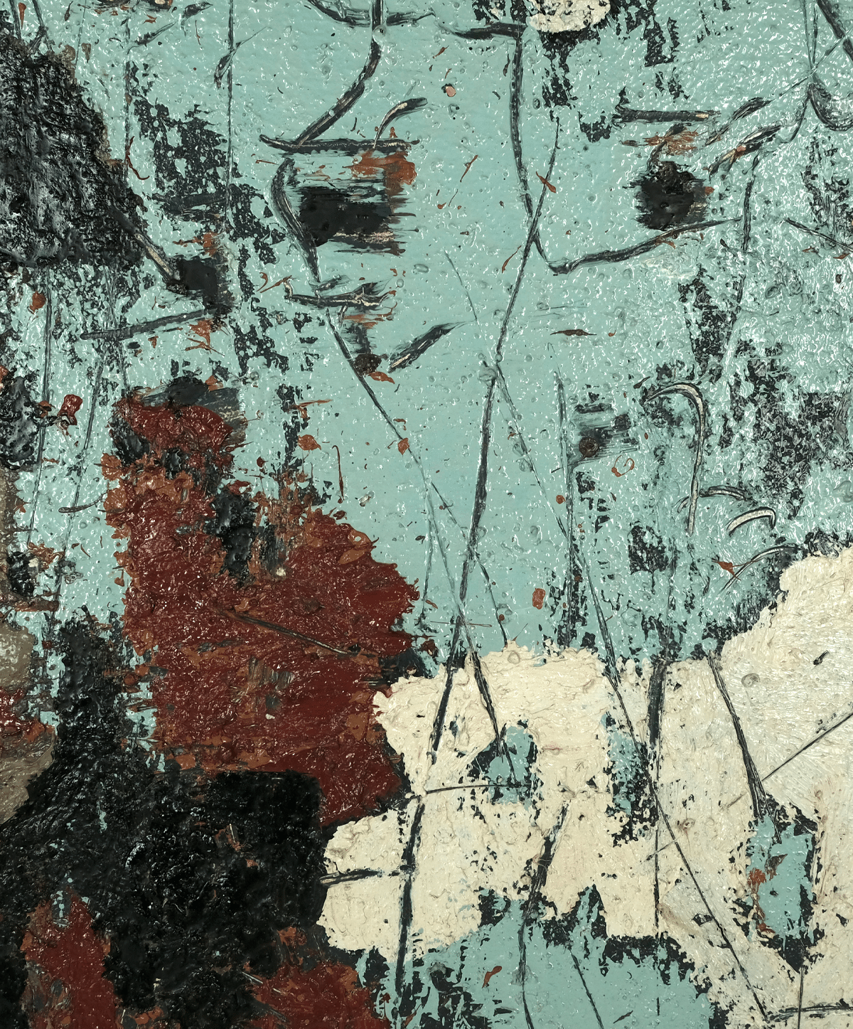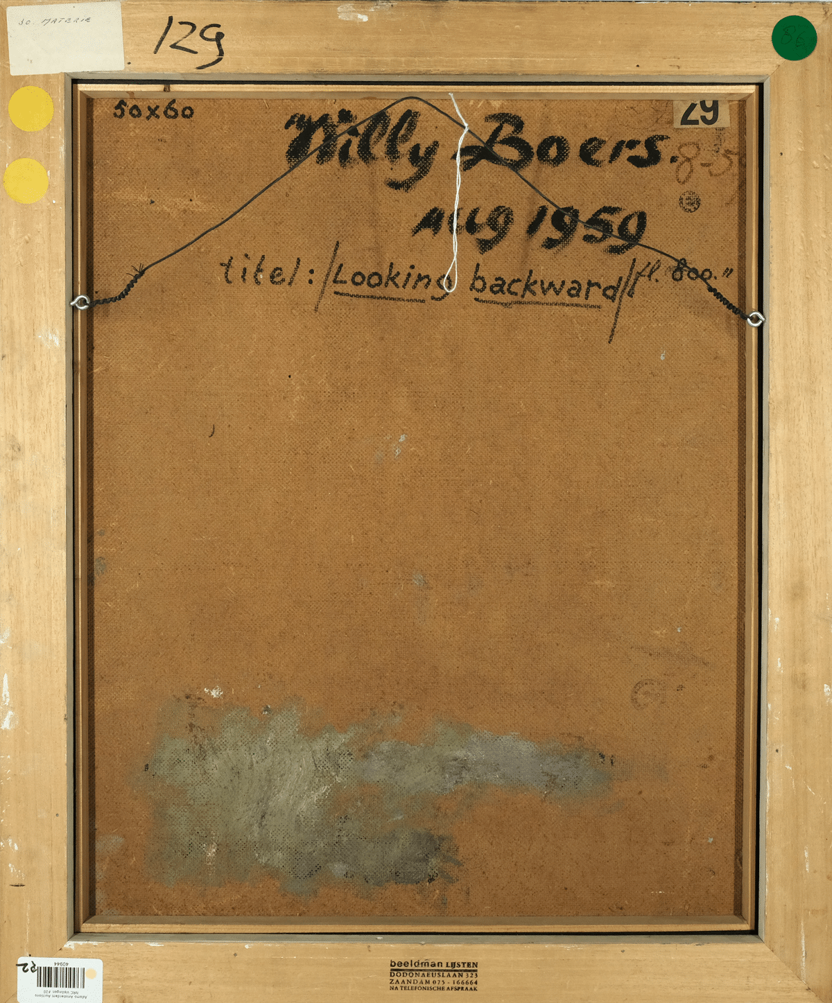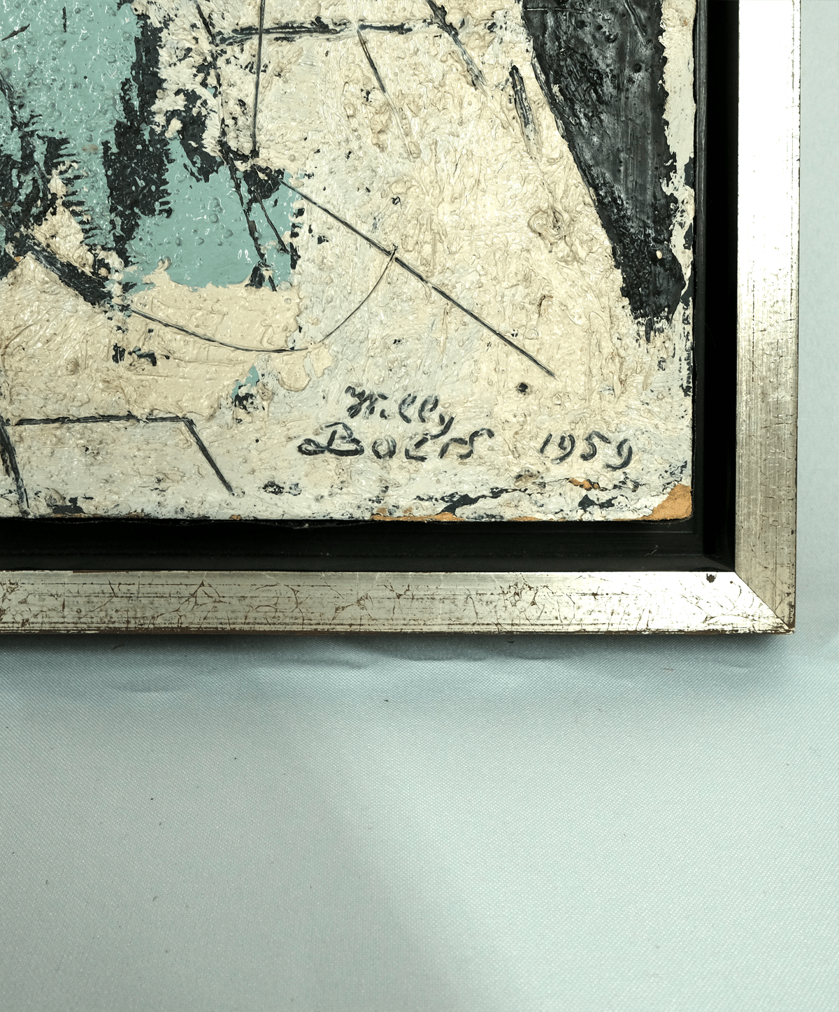 Olieverf op board. 1959. Afmetingen afbeelding ca 60*49 cm, lijst ca 55*66 cm. Gesigneerd r.o. 1959.
