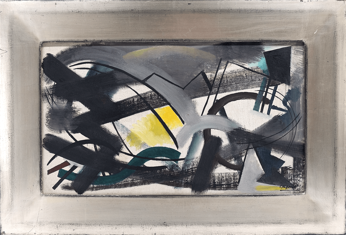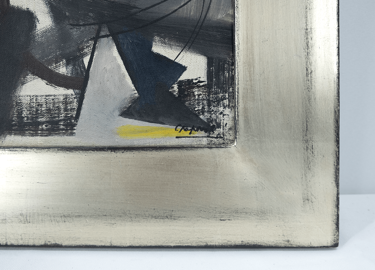Olieverf op doek. 1950, gesigneerd rechtsonder Chapoval, gedateerd op de achterzijde VI 1950. Afmetingen afbeelding ca 46*27 cm, lijst ca 59*40 cm.